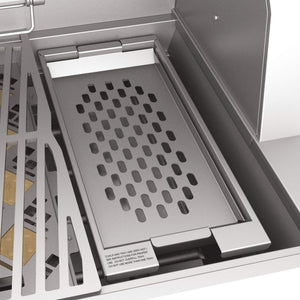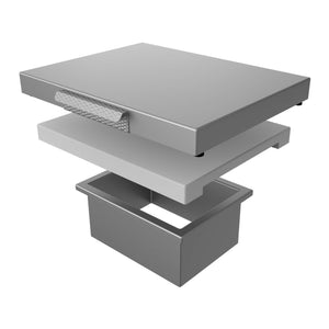 Hestan's commercial-grade cutting board keeps the trash chute hidden, then slides over to provide easy access to drop peels and scraps into the trash bin.