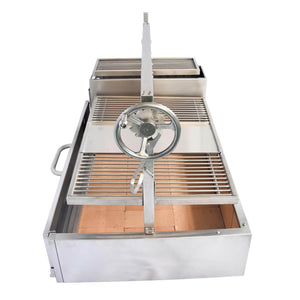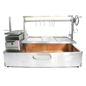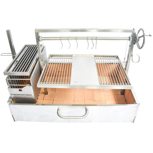 Enhance your outdoor kitchen with the BBQ25SS Santa Maria Grill, made with durable 304 stainless steel. Enjoy true Argentine grilling with height adjustable grates and an interchangeable griddle. The firebox gaucho style brasero ensures quick and effortless charcoal lighting, while the bottom and walls are lined with firebricks for even heat distribution. Perfect for cooking a variety of foods, from meats to vegetables, this grill also includes a 304 stainless steel shovel and coal rake.