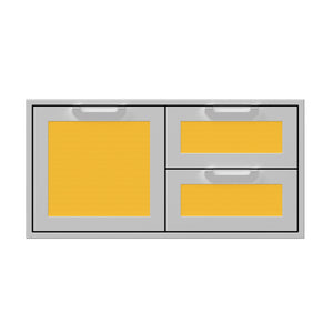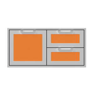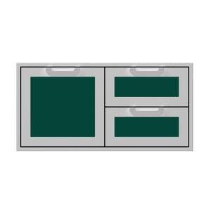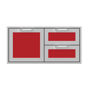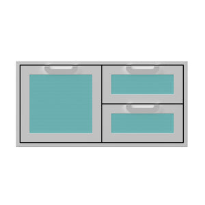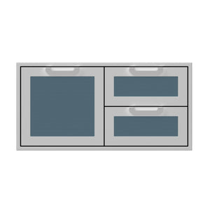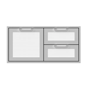 Combo door/drawers deliver highly convenient heavy-duty storage. The commercial-grade handles recessed Marquise Accented panels and heavy-gauge welded body complement Hestan grills in form and function.