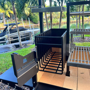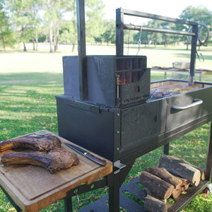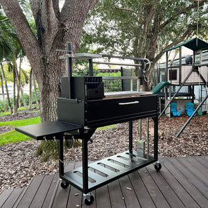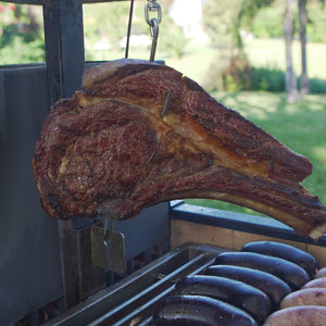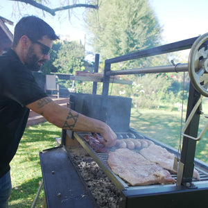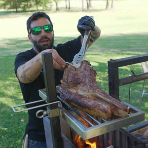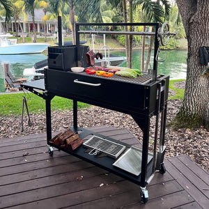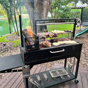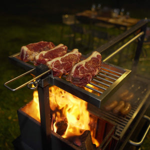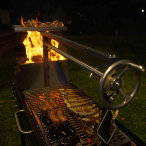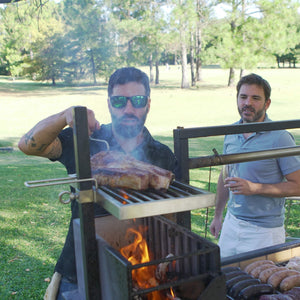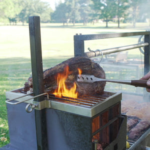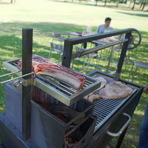 Become the Chief of your backyard with this Argentine grill also known as Santa Maria Grill and grill like a real gaucho. Cook a ribeye, short ribs, picanha, skirt steak or get creative making a flap steak pizza on the main grill. Stir some potatoes or veggies on the small grates and griddle and smoke some pineapples on the S shape meat hooks all at the same time. Regulate the height of the main grates to control the temperature; use the firebox to burn some wood and give a smoky flavor to your food.