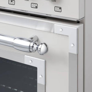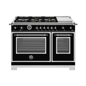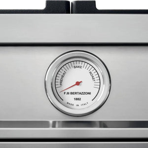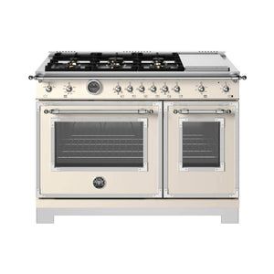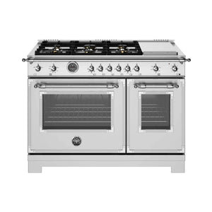 This stainless steel, super-wide range has a cooktop with six gas burners, including a dual-ring power burner, a high-efficiency burner with separately controlled flames, and a stainless-steel electric griddle. The main oven has a balanced air-flow convection fan and a gas broiler. The useful auxiliary oven, without a fan, has a special low-temperature setting. Both ovens include telescopic glide shelves and soft-motion hinges. Triple-glass doors minimize heat loss. Matching range hood and backsplash are available.