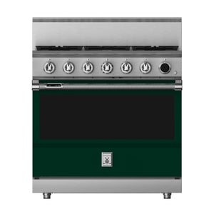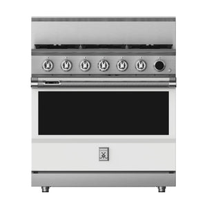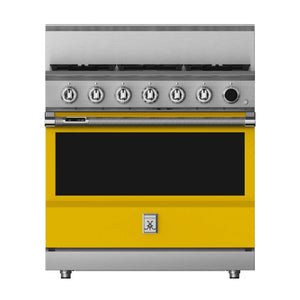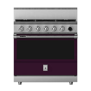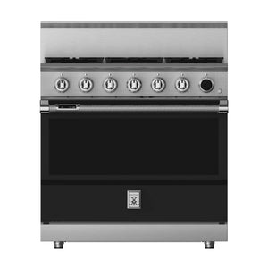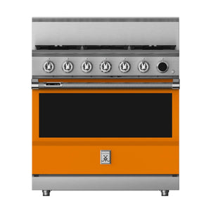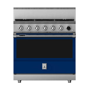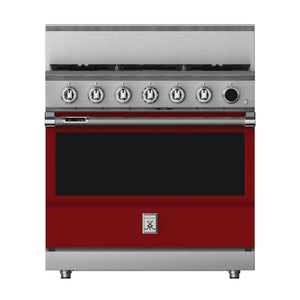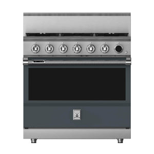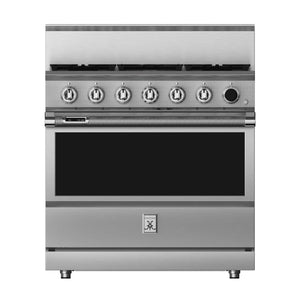This 36-inch dual fuel gas range from Hestan has a 5.8 cu. ft. total oven capacity and 5 sealed burners. Its cast-iron grates provide a continuous uninterrupted and maximized cooking surface for best-in-class coverage. The oven's interior is a porcelain enameled oven cavity for even heat distribution. It also has a high-performance dual-ow burner system that allows for significant turndown capability from high Btu performance (23,000 Btu/hour Front Burners) to low continuous simmer (500 Btu/hour All Burners).