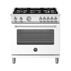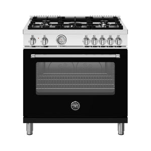 The Bertazzoni Master Series range is precision-engineered for performance and design, bringing a professional touch to your kitchen. The versatile and efficient cooktop includes a high-efficiency dual-ring power burner with controlled flames for delicate simmering and powerful searing. Includes a gas conversion kit for LP and features precision-engineered burners from Italy. The oven has an extra-wide convection fan for even heat distribution, soft-motion hinges for easy operation, and edge-to-edge tempered glass windows to minimize heat loss. The range also has unique handles and knobs that match other Master Series products from Bertazzoni.